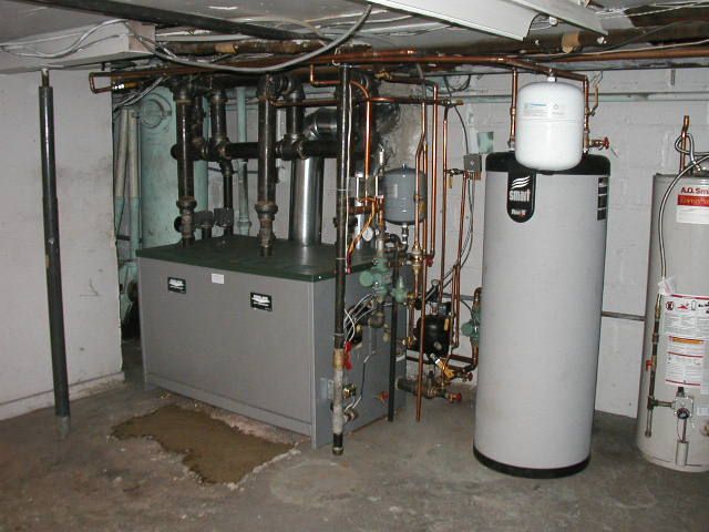 "Folks, this is a residence that I have been installing and adding to in phases over the last 25 years. The blue boiler is a Buderus (German-made) oil-fired hot water (hydronic) unit that serves the home, which includes several zones of multi-temp radiant heat for all the tile floors, European Panel Radiators for the main and bedrooms, Modine heaters for Heated garage/Classic Car workshop and also supplies the tall, white Buderus Solar tank with plenty of domestic hot water for multiple bathrooms, luxury showers and Jacuzzi tubs.